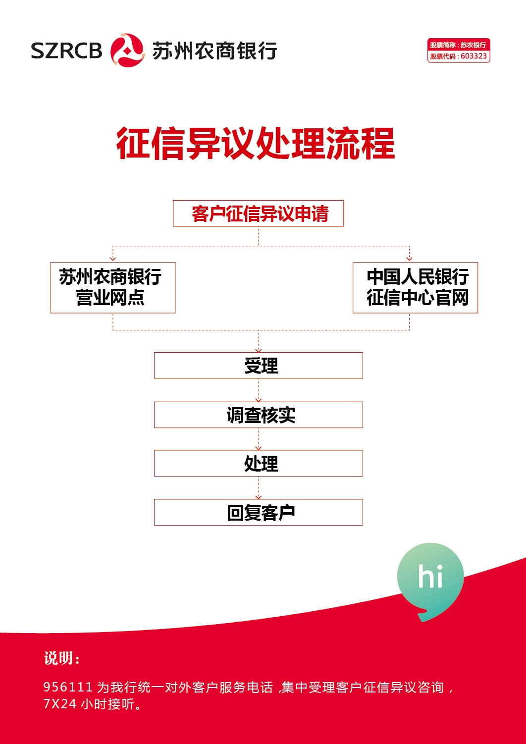 (4)我行自接收到您递交的征信异议申请书面材料之日起,正式受理您的异议申请。在受理异议申请之日起20日内书面回复异议处理结果。